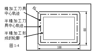 当使用刀具半径补偿来完成环切时,不管我们采用何种方式修改刀具半径补偿值,由于受刀补建、撤的限制,它们都存在走刀路线不够简洁,空刀距离较长的问题。对于象图1-1所示的轮廓,其刀具中心轨迹很好计算,此时如用宏程序直接计算中心轨迹路线,则可简化走刀路线,缩短空刀距离。