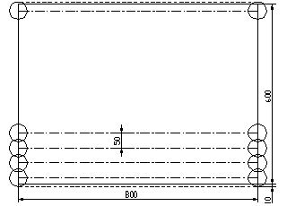 假定工件尺寸如图所示,采用Φ60面铣刀加工,步距50mm,上、下边界刀具各伸出10mm。则行切区域尺寸为800×560(600+10*2-60)。
